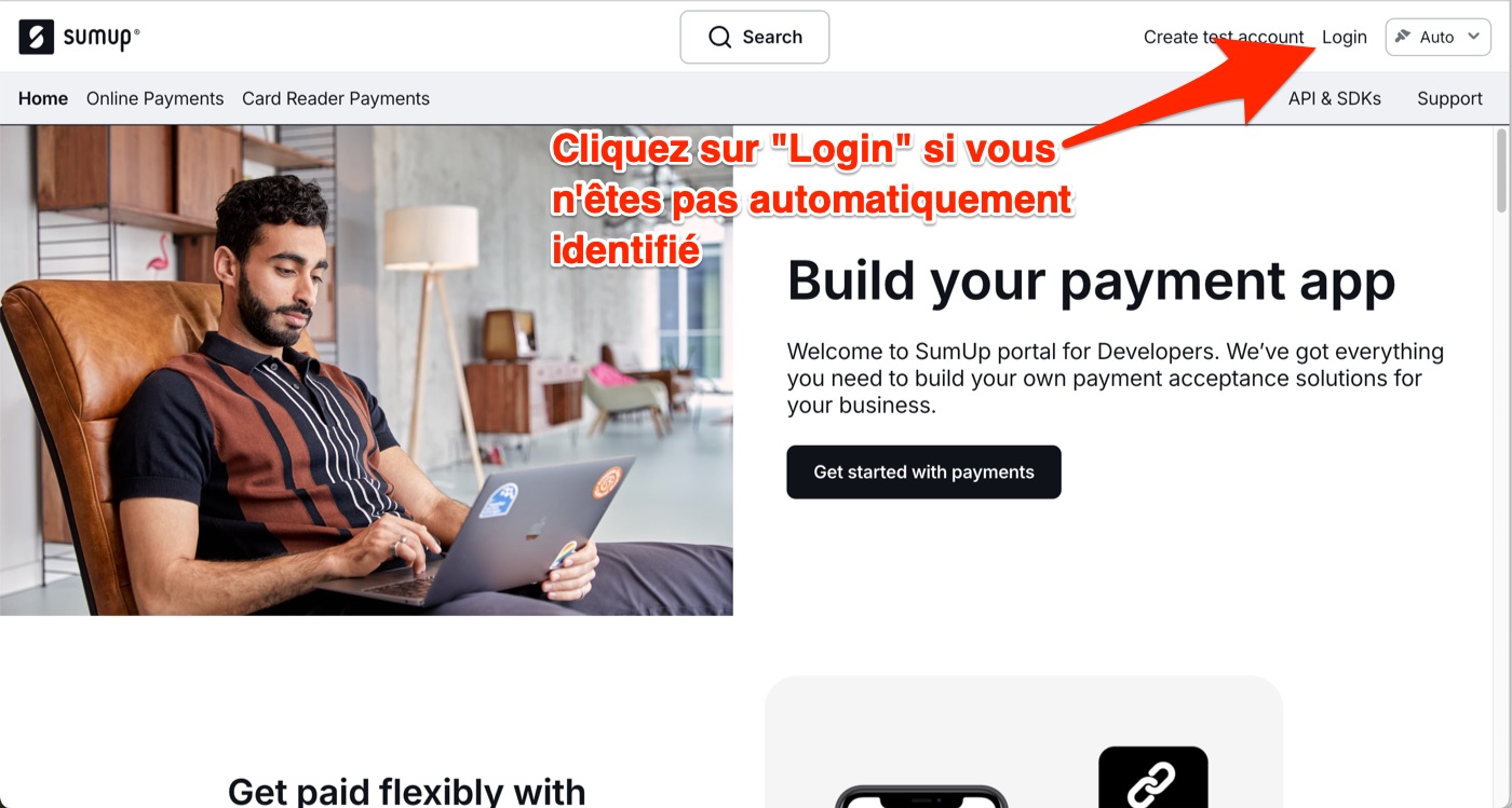 Vous arrivez alors sur la page "Developer" de Sumup. Il faudra peut-être se réauthentifier avec vos identifiants Sumup :