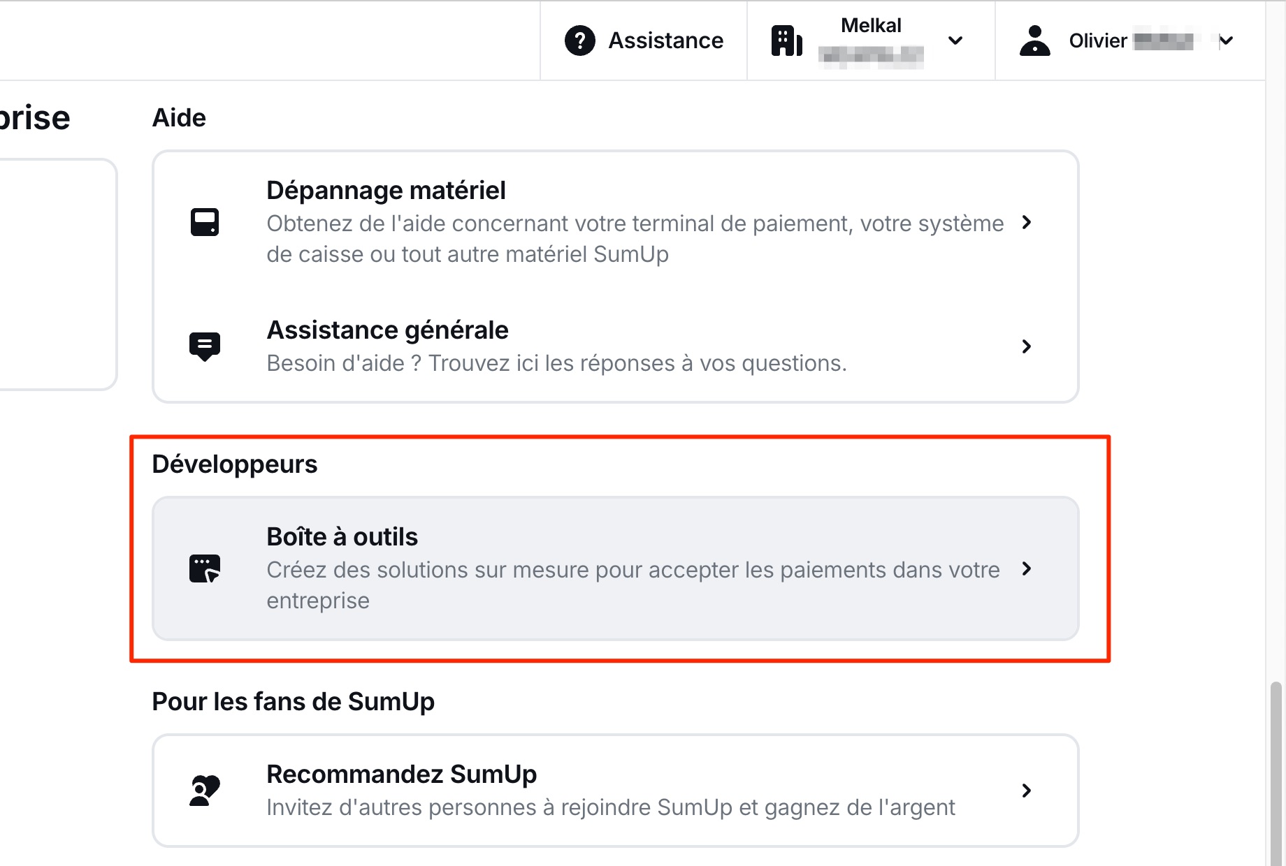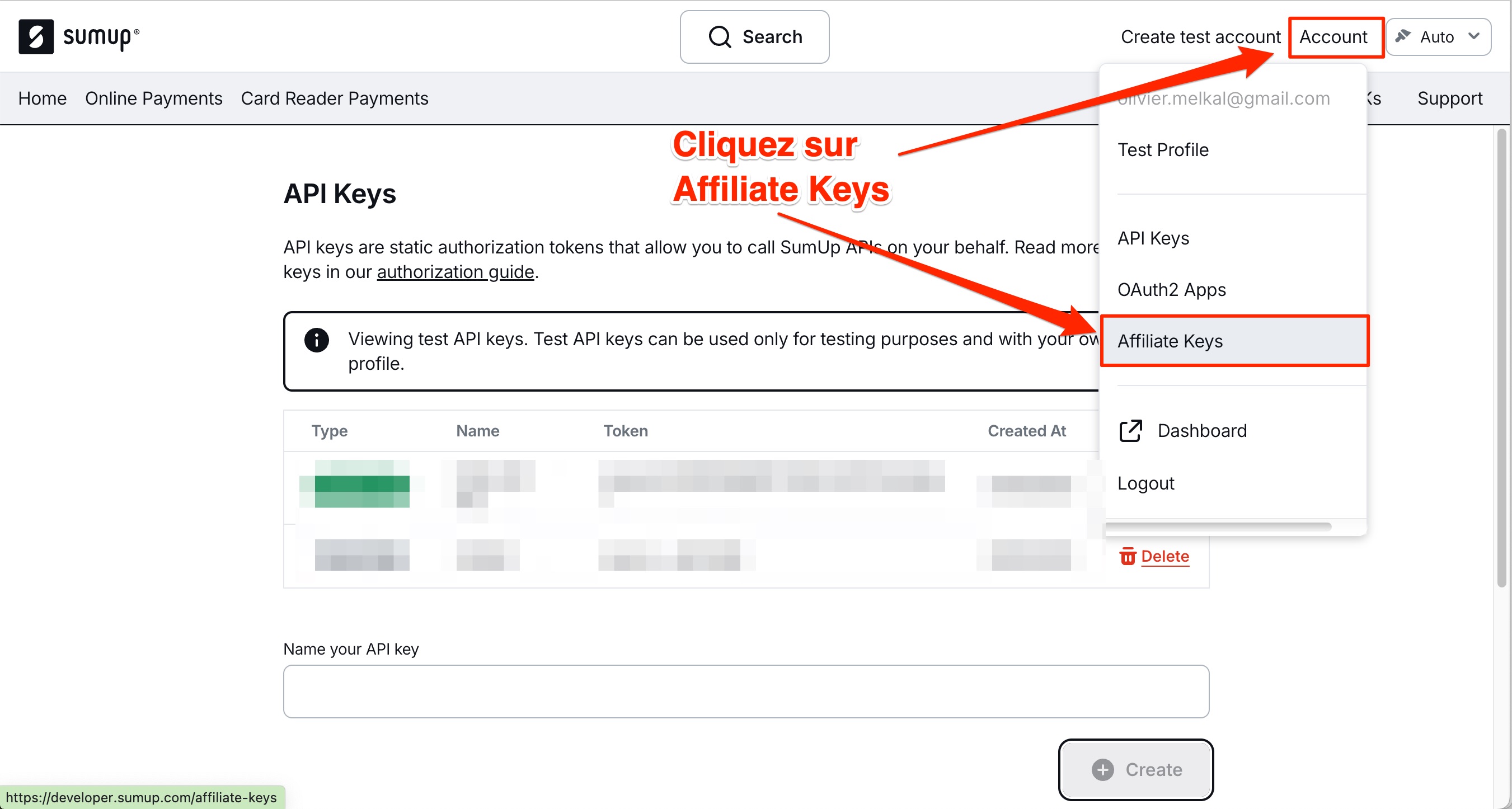 - Sur votre compte en ligne Sumup, cliquez sur "Paramètres", puis sur "Boite à outils", et "API Keys". Cliquez sur "Create" et donnez un nom à cette clé, par exemple "Melkal". Sumup vous donne alors une clé API que vous pouvez copier, puis coller dans la case "Clé API" de Melkal.