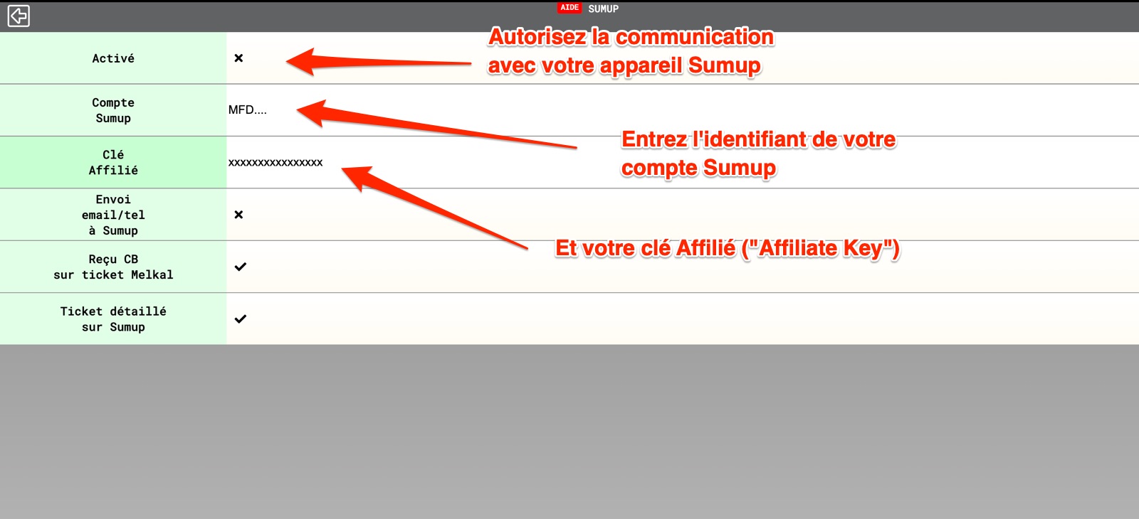Sur la page de réglage Sumup de Melkal, vous trouverez aussi les réglages suivants :