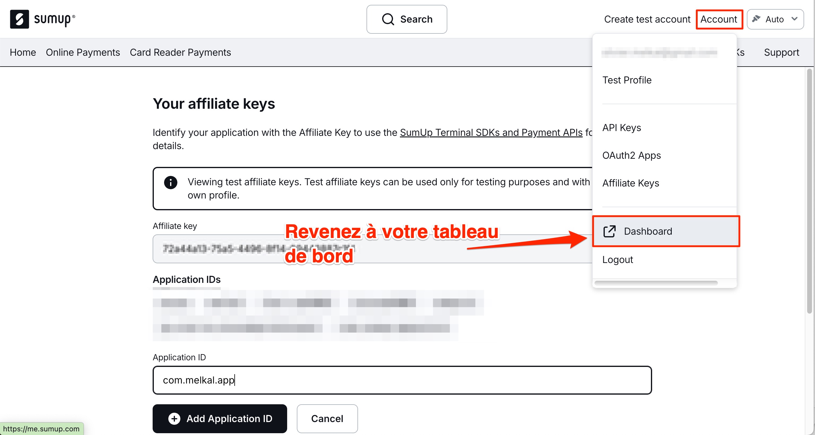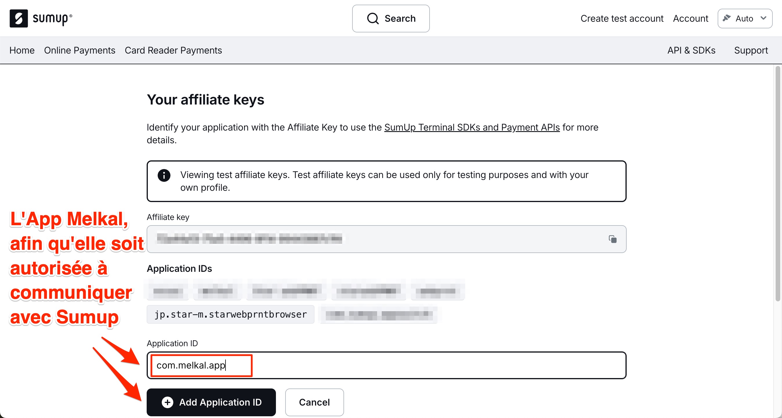 - Cliquez maintenant sur "Affiliate Keys" pour autoriser Melkal à communiquer avec votre appareil Sumup :