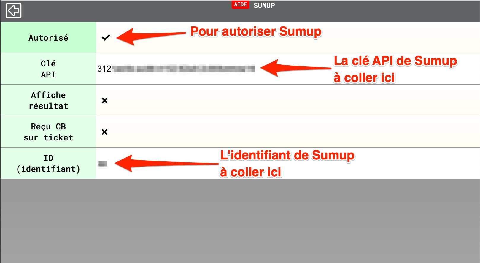 Autorisez "Sumup" et collez sur cette page votre clé Affilié et votre identifiant Sumup.