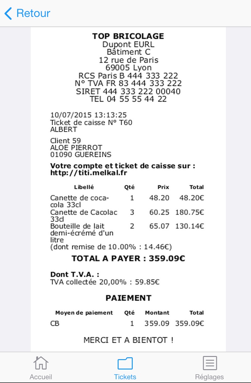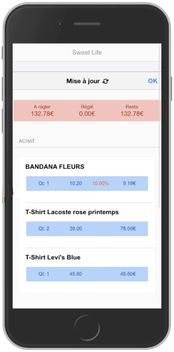 En plus de voir son ticket de caisse en temps réel, le client peut également accéder à son compte avec ses anciens tickets, devis, bons de livraison (BL), factures, cartes de fidélité et d'abonnement, et autres documents. Cette fonctionnalité permet aux clients de garder une trace de leurs achats et de leurs interactions avec votre magasin, tout en réduisant l'utilisation de papier.Ticket de caisse final sur le mobile du client :