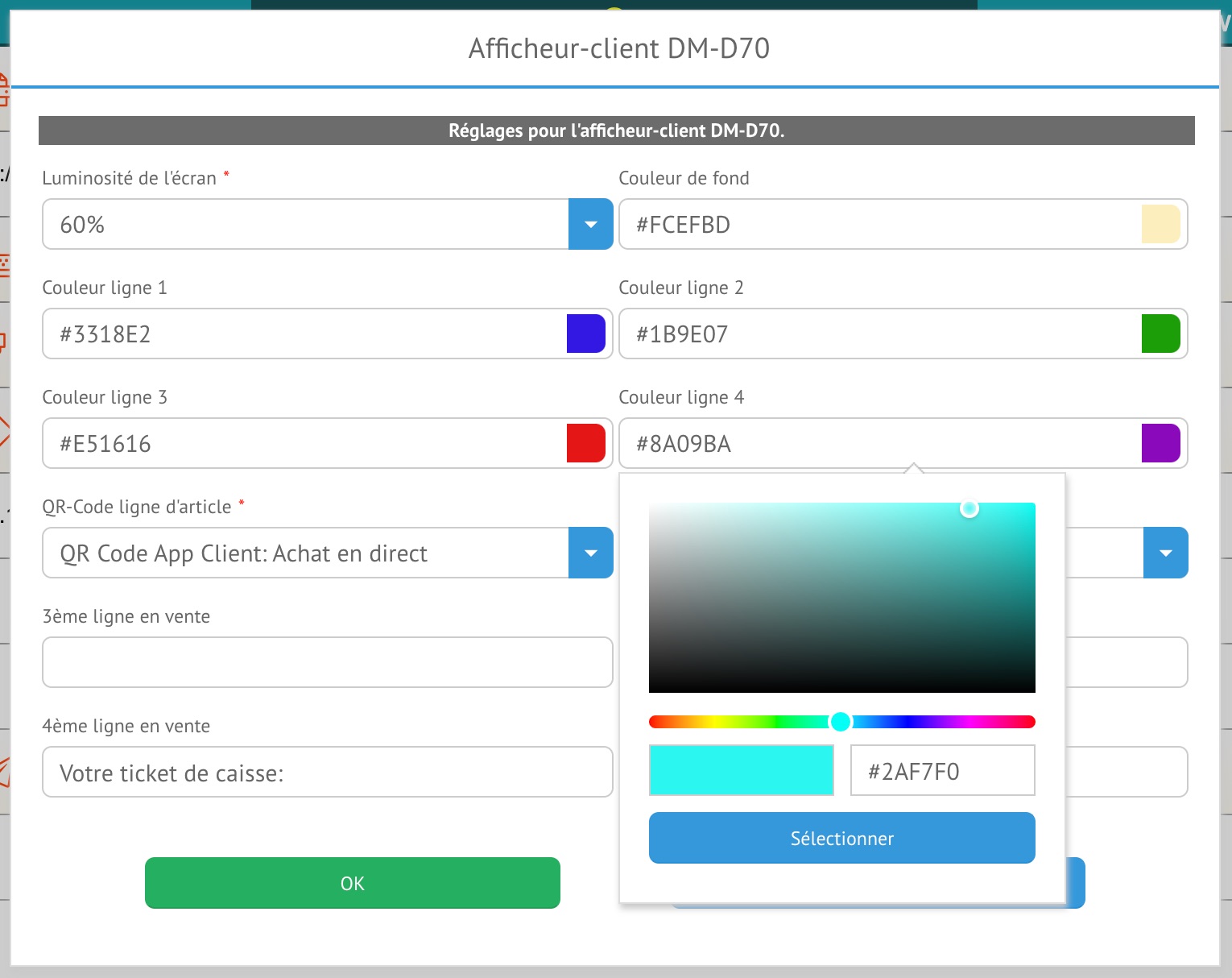 Les réglages de l'afficheur-client Epson DM-D70 dans Melkal offrent une grande flexibilité et une personnalisation accrue. Vous pouvez ajuster les paramètres en fonction de vos besoins spécifiques, que ce soit pour afficher des informations essentielles, des QR Codes, ou des diaporamas de promotions. Les couleurs de fond et de chaque ligne peuvent être réglées à partir de Melkal, ainsi que le texte personnalisé.