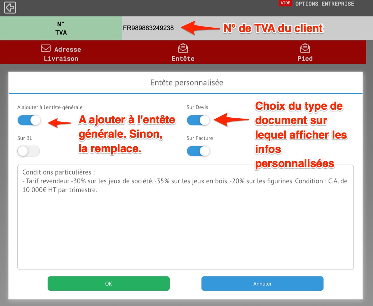 Comme pour les fiches fournisseurs, il est maintenant possible de personnaliser l'entête et le pied de document (devis, BL, facture) pour chaque client. Cette fonctionnalité permet d'imprimer des conditions particulières de vente ou d'autres informations spécifiques au client. Un bouton permet d'indiquer si l'entête personnalisée doit remplacer l'entête générale du magasin, ou si ce sont des informations à ajouter à l'entête générale.Exemple de Conditions Particulières