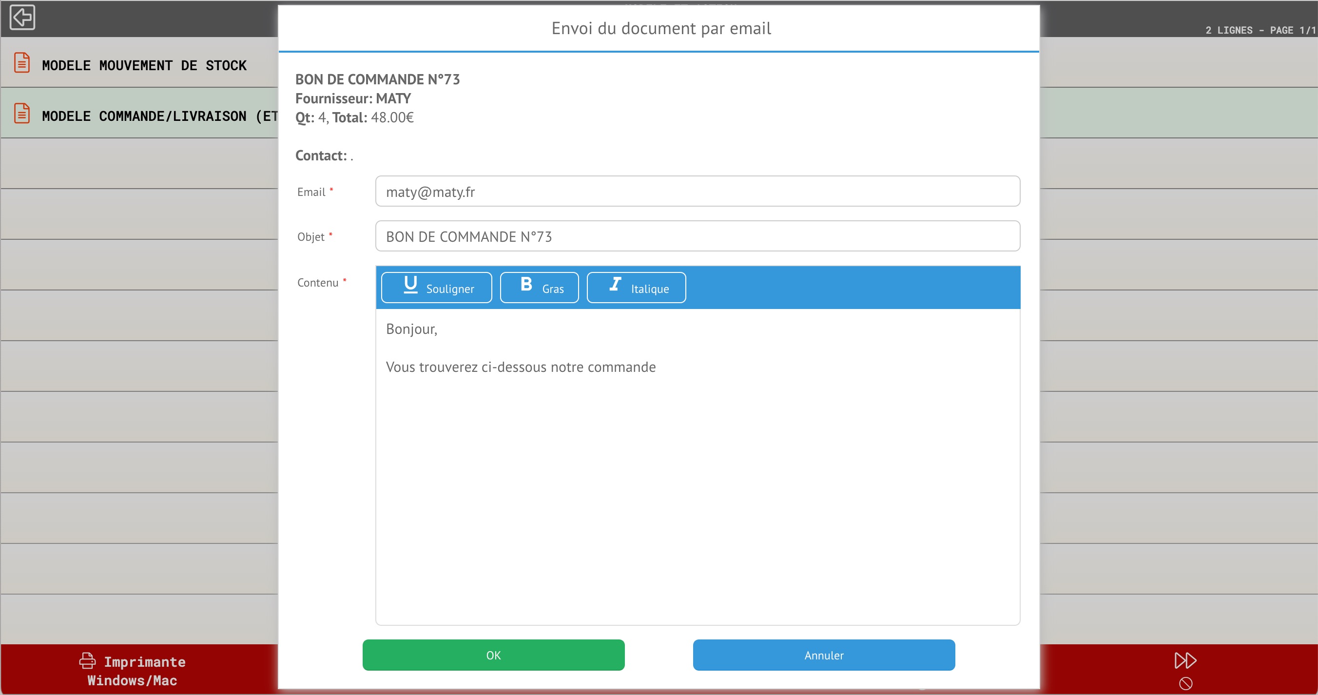 Il est désormais possible d'envoyer directement par email tous les mouvements de stock (commande, réception, sortie, contrôle de stock, inventaire tournant, inventaire complet) à partir du menu "Stock".Si c'est une commande fournisseur, les informations de ce fournisseur sont également affichées dans la fenêtre d'envoi du bon de commande (et dans le bon de commande). L'adresse email du fournisseur est automatiquement reprise, ainsi que votre référence client chez ce fournisseur. Le bon de commande reprend l'entête et le pied de page personnalisés du fournisseur, ainsi que le contenu par défaut de l'email pour ce fournisseur. L'email est aussi personnalisable avant envoi, de sorte que vous pouvez ajouter une demande particulière por cette commande.
