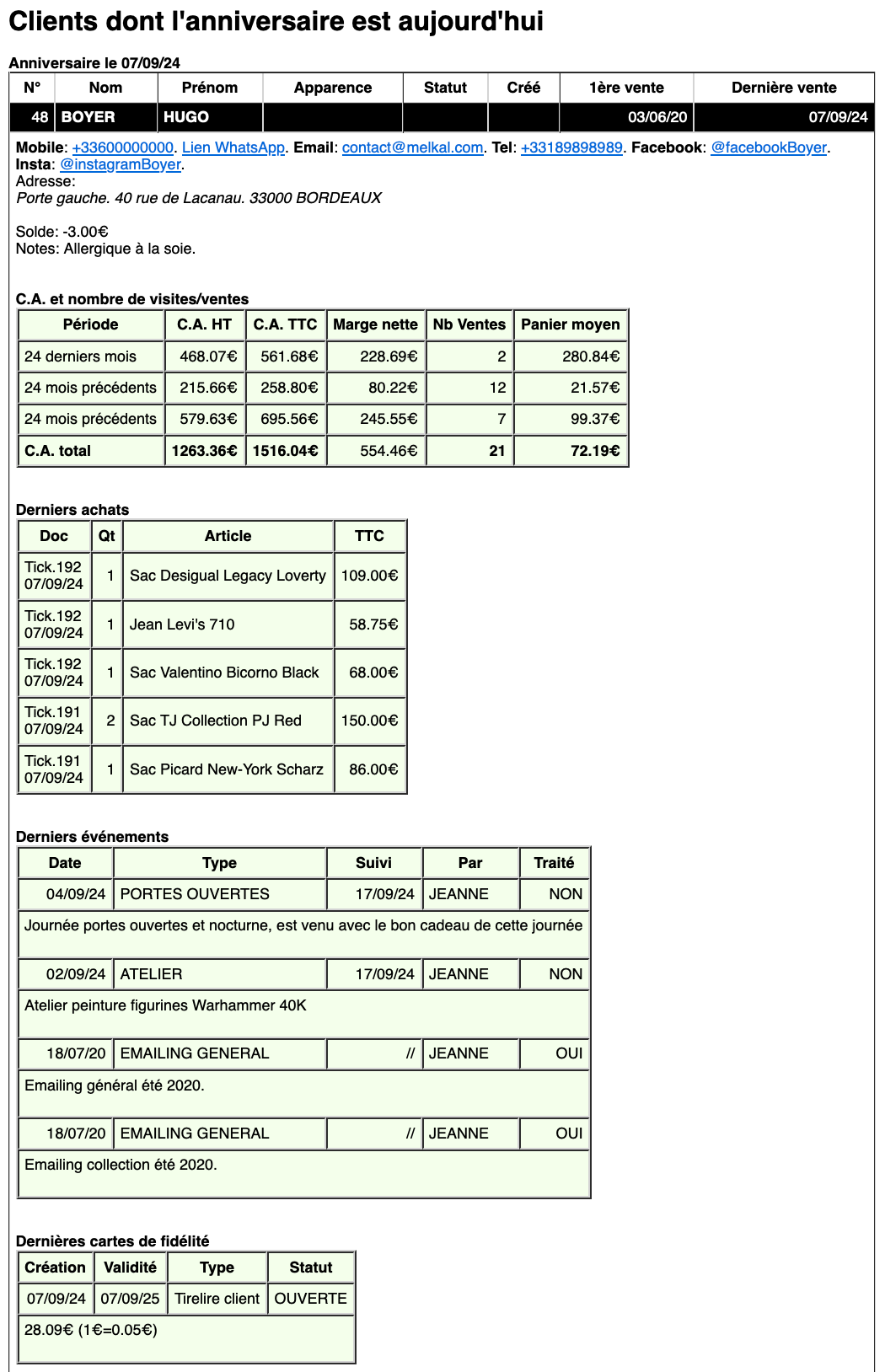 Chaque jour, Melkal vous envoie un listing personnalisé des clients dont la date de suivi d'un événement arrive à échéance. Une option vous permet aussi d'envoyer uniquement les événements dont la case "Traité" n'est pas cochée. Ce n'est pas qu'une simple liste de noms, mais une mine d'informations précieuses sur chacun de vos clients : leurs préférences, leur historique d'achat, leurs coordonnées, l'évolution de leur C.A., marge, l'état de leur carte de fidélité...